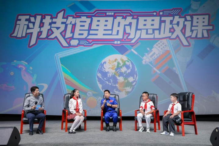 作为本次活动的亮点之一,“科技馆里的思政课”为现场青少年超前点映航天主题电影《窗外是蓝星》。作为我国首部8K拍摄太空电影,该影片在“天宫”空间站舱内,以全新的拍摄模式,呈现一场充满中国式太空美学的非凡旅程。影片中许多前所未见的太空景象,以及太空生活中不为人知的细节,引起现场青少年的阵阵惊叹。中国首位太空教师王亚平与现场青少年互动,讲述“从舷窗看地球”的独特体验,为青少年答疑解惑;王亚平将第一次“天宫课堂”中“永不停止”的陀螺也带到了现场,与青少年分享亲身经历的太空故事:“这个陀螺跟着我经历了神舟十号和神舟十三号两次飞行任务,也见证了我两次飞天之旅,对我来说具有特别有意义。希望这个小陀螺,能点燃大家心中对科学好奇。”活动现场,王亚平带领青少年重现“天宫课堂”中的“水膜张力”实验:将一朵从太空中带回地面的纸花放在水面上,在水的表面张力作用下,纸花由折叠状态逐渐绽放,让现场青少年再次领略“飞天梦永不失重,科学梦张力无限”的含义。航天英雄、中国载人航天工程副总设计师杨利伟与参加中国空间站科学实验项目的青少年在台上面对面互动,引导青少年探索航天领域的神奇奥秘,激发青少年对航天事业的无限热爱和憧憬。